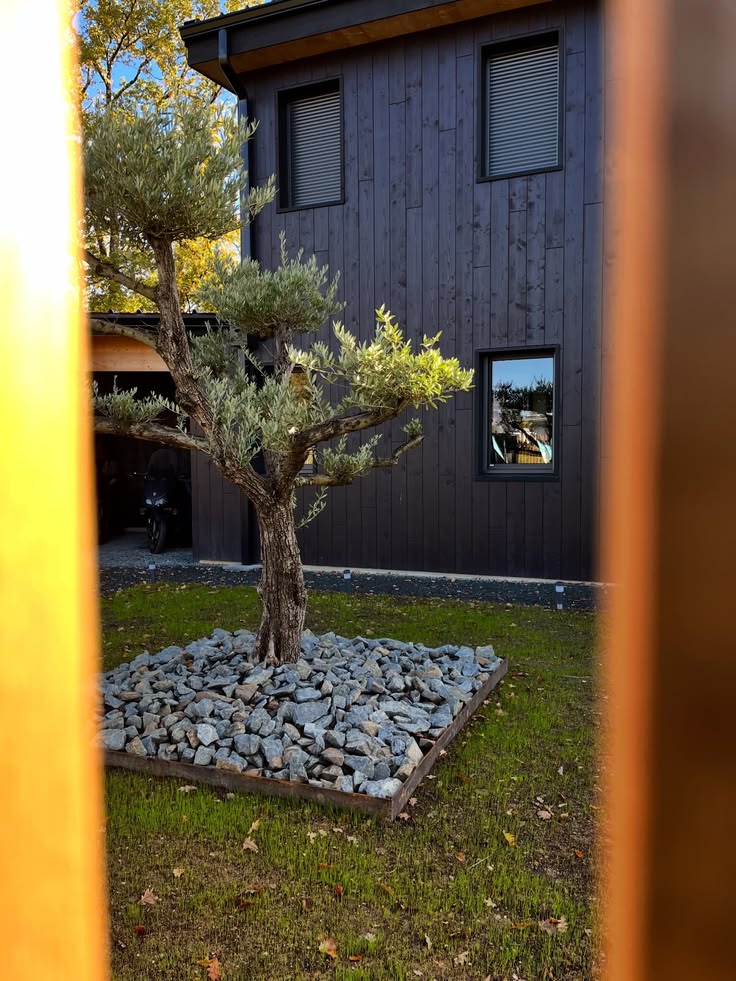 Un extérieur qui prolonge naturellement l'identité architecturale de la maison : lignes nettes, palette de couleurs maîtrisée (bois, anthracite, gris minéral, vert de l'olivier), et un équilibre réussi entre le minéral et le végétal. L'ensemble donne une impression de soin et de cohérence dès l'entrée de la propriété.